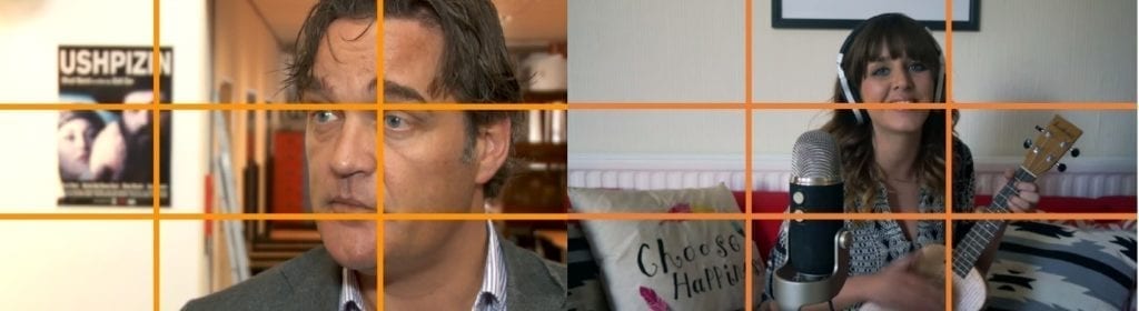 • Film aan de hand van de ‘Rule of Thirds’. Plaats een voorwerp of persoon altijd op een van de assen (zie afbeelding 2 en 3). Ga je voor een formele, interview uitstraling: plaats dan de geïnterviewde links of rechts in het beeld en laat diegene schuin het beeld uitkijken. Ga je voor een informele, vlog uitstraling: plaats dan de persoon in het midden van het beeld en laat die recht het beeld uitkijken;