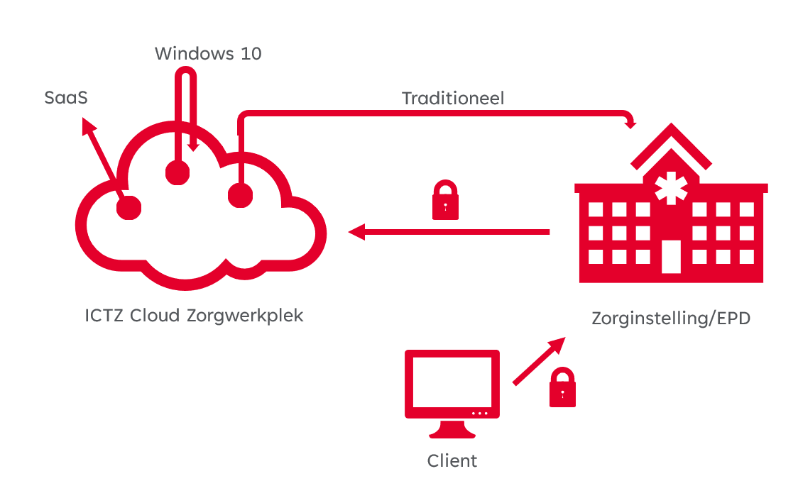 Eén van deze innovaties is werken in de Cloud. ilionx heeft in samenwerking met zorgspecialisten (mensen met kennis van de zorg) de Cloud werkplek verrijkt voor het dagelijkse zorgproces. Het resultaat, de Healthcare werkplek, fungeert als virtuele centrale desktop voor de gebruiker van waaruit alle typen applicaties centraal benaderd kunnen worden. Dus zowel de Windows 10 omgeving van jouw organisatie met diverse SaaS oplossingen, maar ook de kritieke client-server applicaties met daarin de diverse patiëntgegevens. De reden dat we geen volledige Cloud integratie nastreven is het kunnen ondersteunen van de diverse legacy applicaties waar patiëntgegevens worden verzameld of bijgehouden. De zorgwerkplek wordt benaderd via private verbindingen waarbij de patiëntgegevens actief blijven binnen de zorginstelling of ziekenhuis. Mocht er ooit sprake zijn van uitval of een veiligheidslek binnen een Cloud dienst, dan merkt jouw zorgpersoneel daar niets van bij het raadplegen van patiëntgegevens. De applicatie is onverminderd exclusief beschikbaar. De computer resources voor de cloud desktop betaal je alleen als deze in gebruik zijn, want waarom zou je betalen als in de avond maar 10% van het personeel aanwezig is.