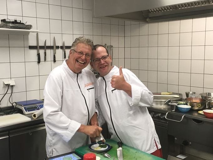Chefkok Erik te Velthuis van Papendal Topsportrestaurant en cliënt Willem aan het koken